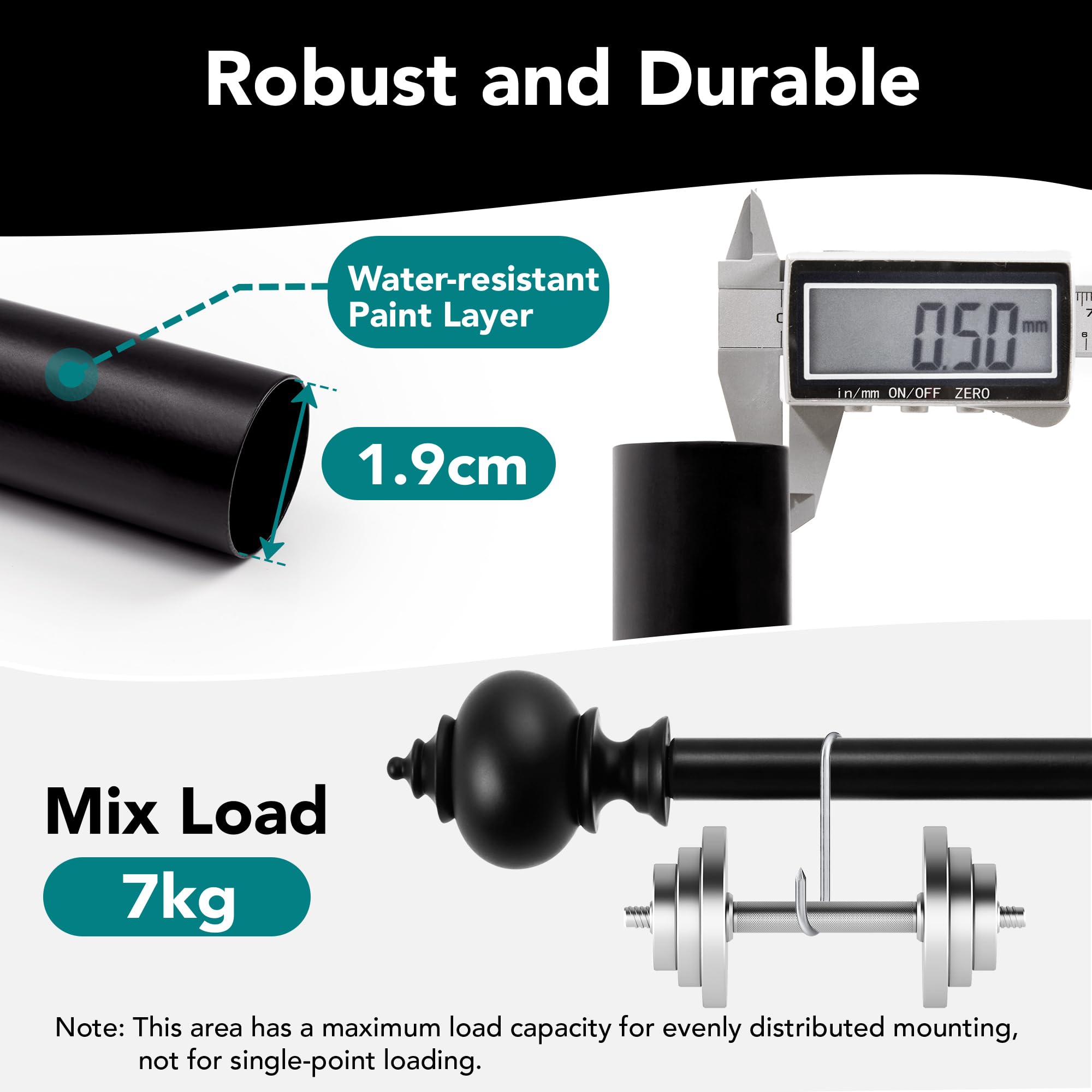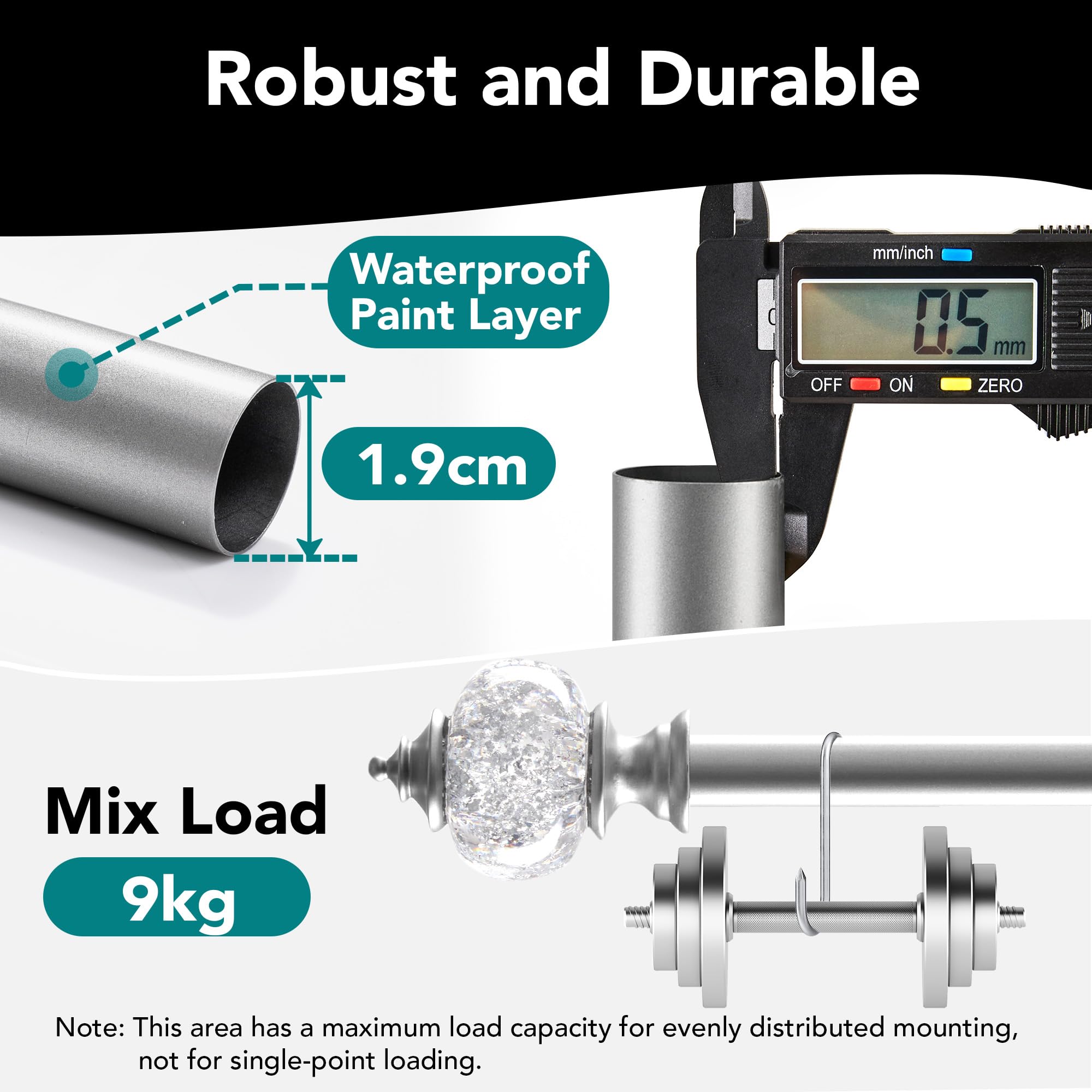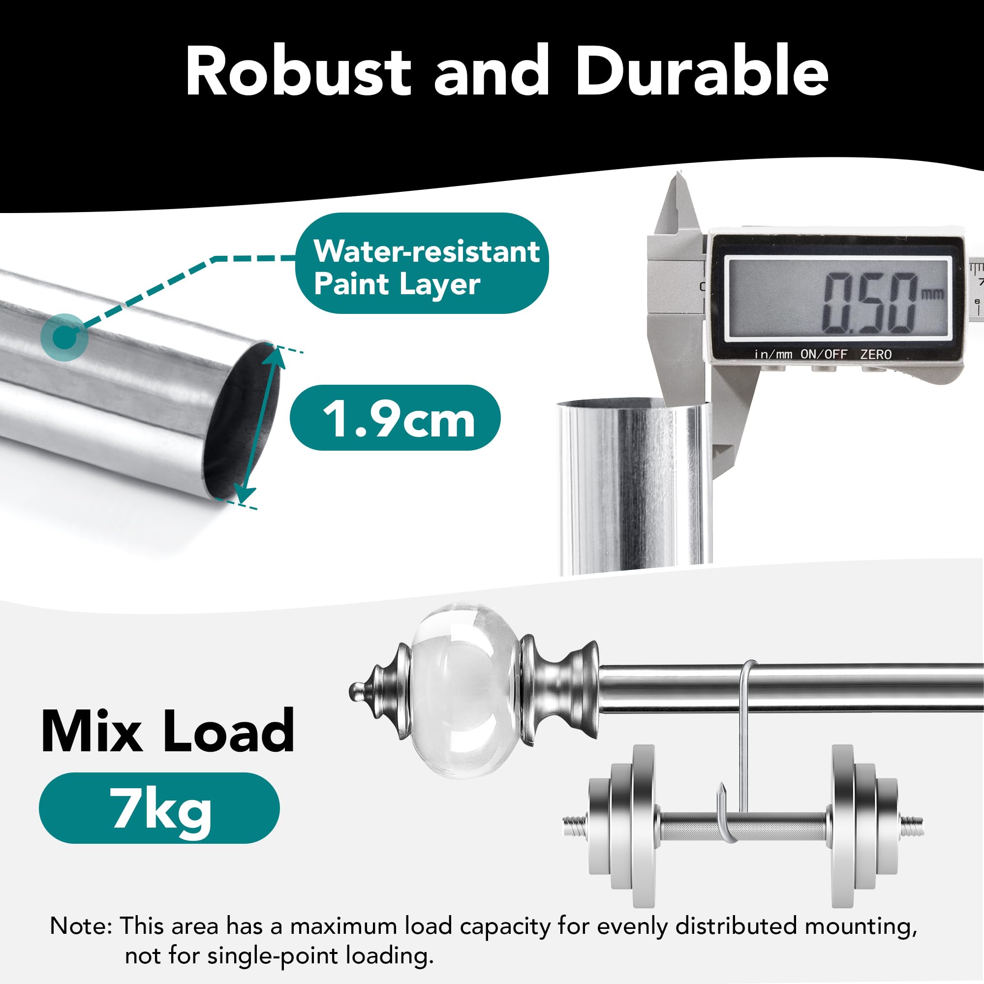 Strong and Sturdy - This curtain rod is crafted from premium metal, boasting both lightness and durability, ensuring stability and longevity. Featuring a sturdy mounting bracket and a 3/4-inch diameter rod, it can support up to 11KG. Distinct from traditional single-rod designs, spliced construction and extendable ends allow it to adapt to varying space sizes while maintaining structural integrity, thus ensuring a perfect curtain hanging effect.